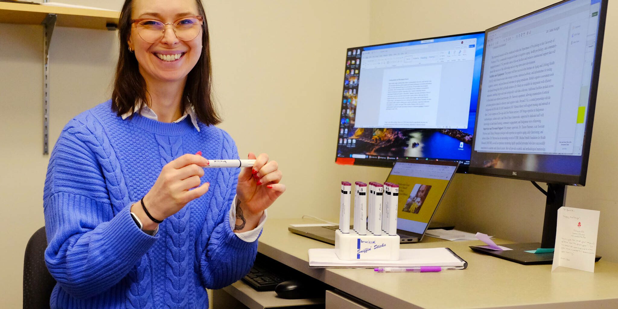 University of Victoria postdoctoral fellow and olfactory expert Jamie Knight poses in her office holding sniffin’ sticks, a device used to test the sense of smell. (Olivier Laurin/Saanich News)
