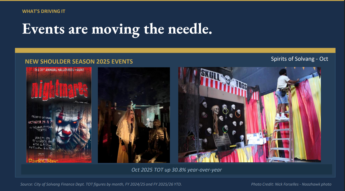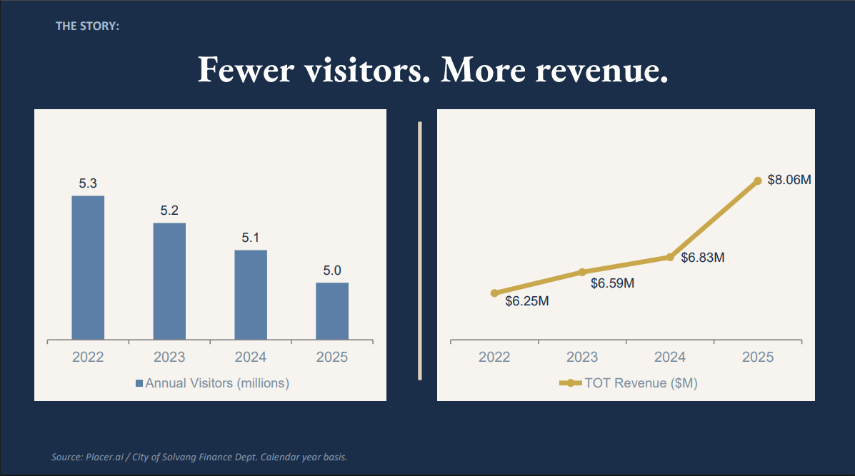 According to city data, annual visitation in Solvang has declined modestly from about 5.3 million visitors in 2022 to roughly 5.0 million in 2025. Over the same period, transient occupancy tax (TOT) revenue rose from approximately $6.25 million to more than $8 million, before settling at about $7.3 million in the current fiscal year.