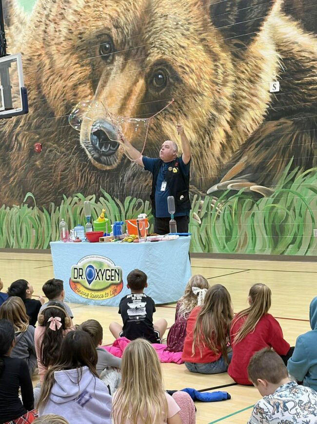 Dr. Oxygen made a special visit to Blue Sage Elementary School last week. Above, Dr. Oxygen makes giant bubbles. Below, a student smiles with bubbles on his head.